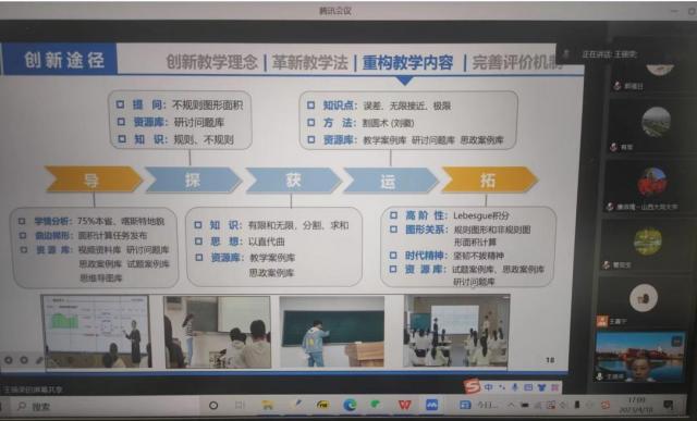 王锦荣教授以《高等数学》课程中定积分的概念为案例,结合科研中的问题分享了一核五环六库教学法。秉承“学生为中心、成果为导向、问题为驱动、应用为指引、思政为根基”的教学理念,从丰富教学资源、优化教学内容、革新教学模式、重建考核评价方面进行教学改革和创新。实现了“筑信念、厚基础、善应用、重创新、高素养”的教学目标。报告持续了一个多小时,报告结束后,王锦荣教授与在线教师进行了积极的互动交流。