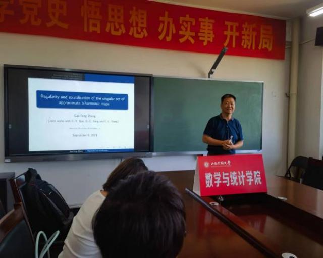 9月6日下午3点,华中师范大学太阳成集团tyc7111副院长郑高峰教授应邀作题为“Regularity and stratification of the singular set of the approximate biharmonic maps”的学术讲座。会议由刘有军院长主持,科技部康淑瑰部长,马小箭副院长和我院相关教师听取了报告。