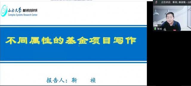 12月13日20:30,学院邀请了山西大学靳祯教授作了题为“不同属性的基金项目写作”的线上学术报告,会议由康淑瑰教授主持,学院50岁以下教师参加该报告。