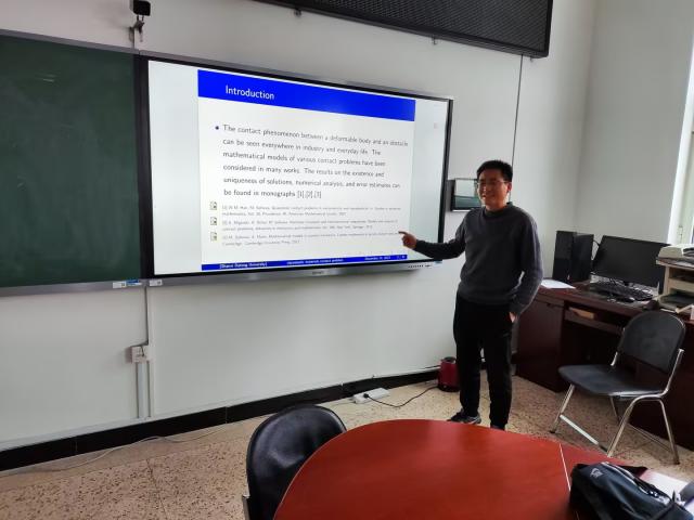 2023年12月14日下午15:00,学院博士郭福日做了题为“A class of contact problem for viscoelastic materials with wear”的学术讲座。该讲座是我校本学期“博士论坛”系列讲座之一。讲座由副院长马小箭主持,学院部分师生参加了此次学术交流。