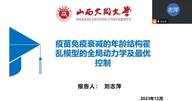 12月22日上午9:00,学院博士刘志萍在本真楼A308作了题为“疫苗免疫衰减的年龄结构霍乱模型的动力学行为及最优控制”的学术讲座。该讲座是我校本学期“博士论坛”系列讲座之一。讲座由院长刘有军主持,线上、线下同时进行,学院师生积极参与了此次学术交流活动。