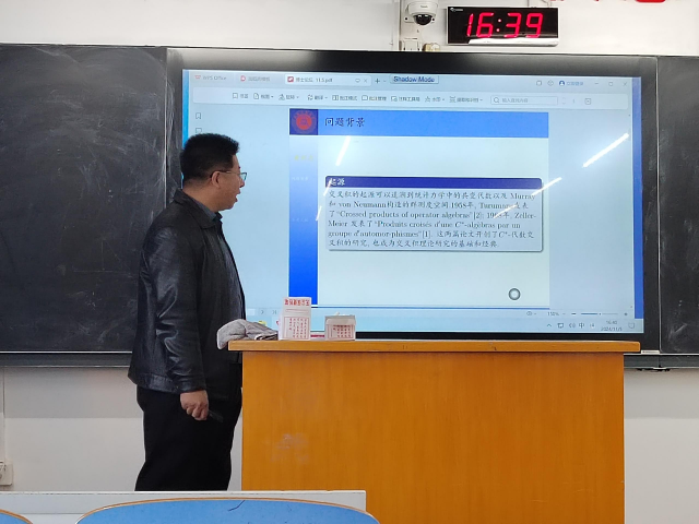 黄利忠首先介绍了交叉积代数表示理论的研究背景,在量子物理学中,时间演化或者对可见物的空间变换都可描述为C*-代数动力系统,因而交叉积理论目前已成为众多数学家们研究的热点,随后对交叉积表示理论最新的研究成果进行简单地说明。在报告中,他详细讲解了Banach代数交叉积与Pro-Banach代数交叉积之间的关系,特别指出当局部紧群顺从时,Pro-Banach代数交叉积与Pro-Banach代数约化交叉积同构的。Banach代数及Pro-Banach代数表示理论不仅在算子代数、K-理论、拓扑同调论等数学分支中有着广泛的应用,而且对其它学科也有重要的推动作用。