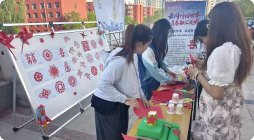 活动搭建起数学与文化深度交融的跨学科实践平台,摒弃传统单一文化解读模式,以创意手抄报、数据海报、算法短视频、剪纸活动等为载体,引导学子用几何构图、统计图表、函数曲线等数理知识解读云冈石窟,将抽象数理转化为具象工具。其中,数统学院的“数韵传承 非遗剪纸”展区别具匠心,剪纸花卉图案线条细腻、栩栩如生。这种创新实践让学生在动手创作中深化对数学与历史的双重认知。
